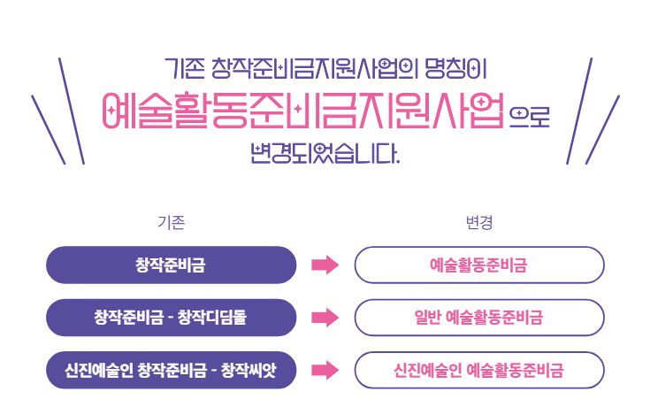 2024년 예술활동준비금지원사업은 기존의 창작준비금지원사업에서 명칭이 변경되었습니다.
