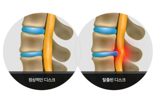 나이가 들어감에 따라 수핵의 수분함량 감소로 탄력성이 떨어지면서, 또한 나쁜 자세나 사고 등의 외부적인 자극이 가해져 디스크가 밀려나 주위 신경근을 자극하여 통증을 일으키는 것을 '허리 디스크(추간판 탈출증)'이라 합니다.